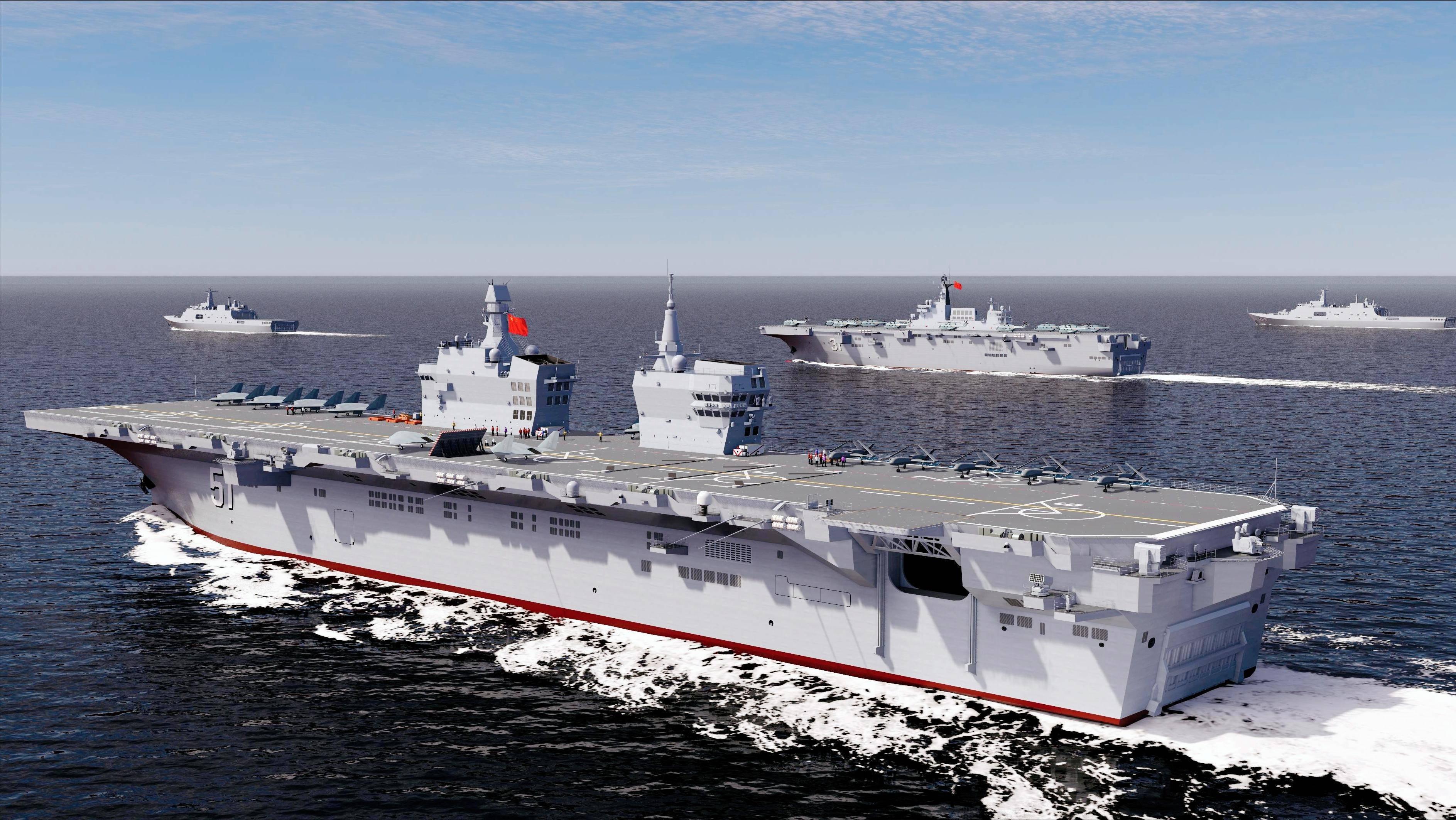 這種船以前在大家眼裏,就是拉着直升機、帶着登陸兵去搶灘登陸的,地位排在航母后面。可076一露面,以前的那些老印象就得全推翻。這船滿載排水量奔着4萬多噸去了,塊頭直接對標美國最先進的“美利堅”級。