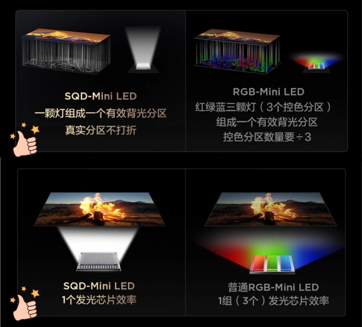 要搞懂兩者的差距,首先得從最核心的物理架構說起。RGB-Mini LED採用的是“三燈一分區”的設計,必須由紅、綠、藍三顆燈珠組合,才能構成一個有效控光分區;而SQD-Mini LED則實現了“一燈一分區”,單顆燈珠就能獨立成爲一個有效分區。僅從這一架構差異就能看出,在同等成本、同等燈珠數量的前提下,SQD-Mini LED的物理分區數量能達到RGB-Mini LED的3至6倍之多,控光精度自然更勝一籌;同時RGB-Mini LED需三色芯片組合成白光,受技術、成本限制,相同溫度下三顆燈效率均不及SQD單燈,因此,SQD-Mini LED更高的發光效率也爲更高峯值亮度奠定基礎;控光精度、發光效率這兩點讓SQD-Mini LED在覈心硬件層面就佔據先天優勢。