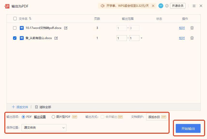 導入多個待轉換的Word文件後,設置轉換參數,包括是否添加水印、轉爲圖片型PDF以及輸出目錄。