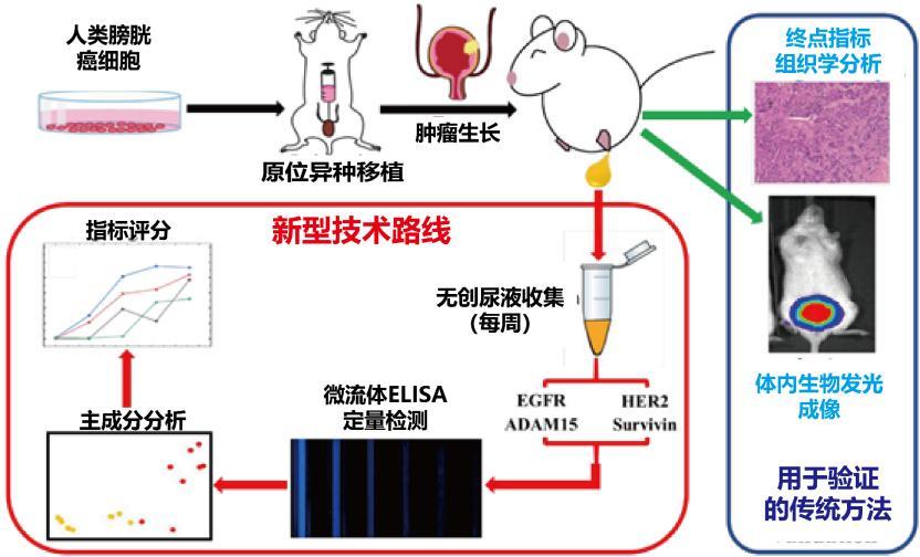 除常規尿檢之外,近年逐漸發展的高靈敏生物分子傳感技術,將尿液中的可解讀信息推向一個新的高度。由於尿液直接來自於腎臟的代謝,並在膀胱中儲存,其中天然就含有能反饋腎臟及膀胱疾病的核酸、蛋白類生物標誌物。在我們的前期研究中,曾開發出一種通過檢測小鼠尿液中多種膀胱癌相關蛋白標誌物,實現對膀胱癌原位生長進行實時、無創監測的技術。它不僅可以有效檢測膀胱癌的病理進程,還能對腫瘤靶向藥物的治療效果做便捷的觀測,有望在未來成爲一種普惠大衆的腫瘤治療輔助觀測手段[1]。
