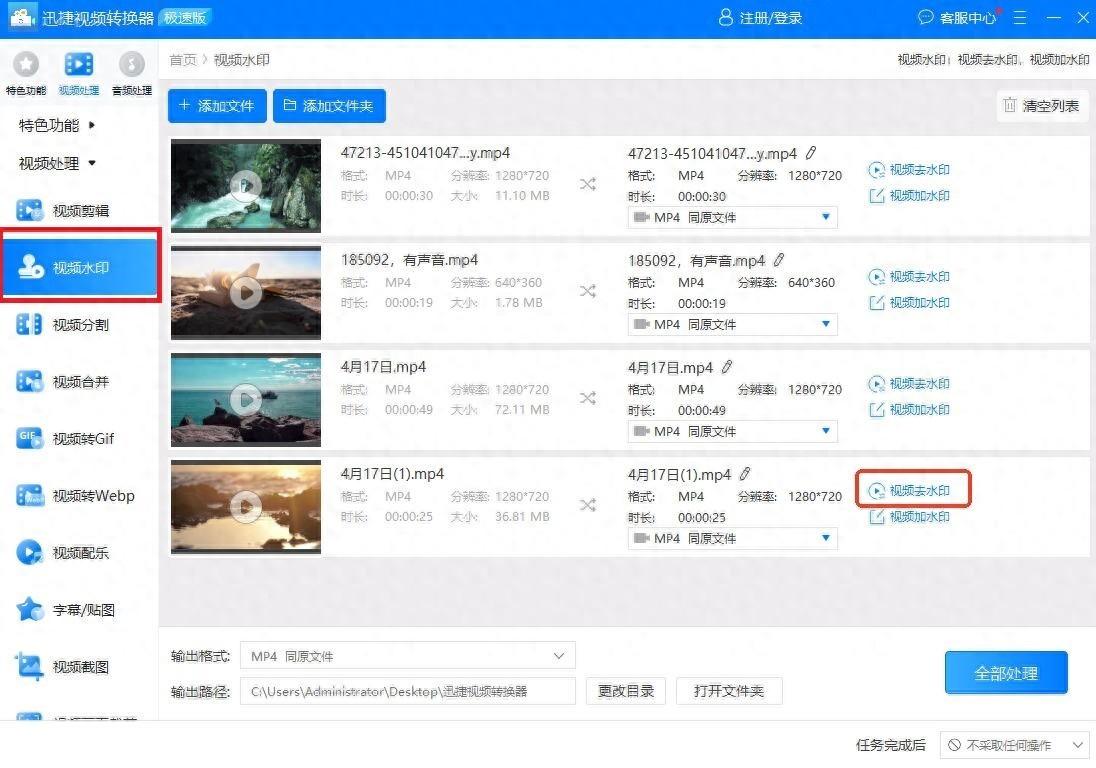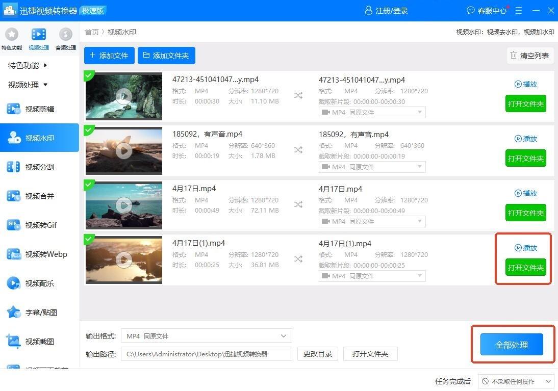 再設置一下左下角的輸出格式和輸出目錄,最後點擊右下角的【全部處理】,很快就能得到去除水印後的視頻了。
