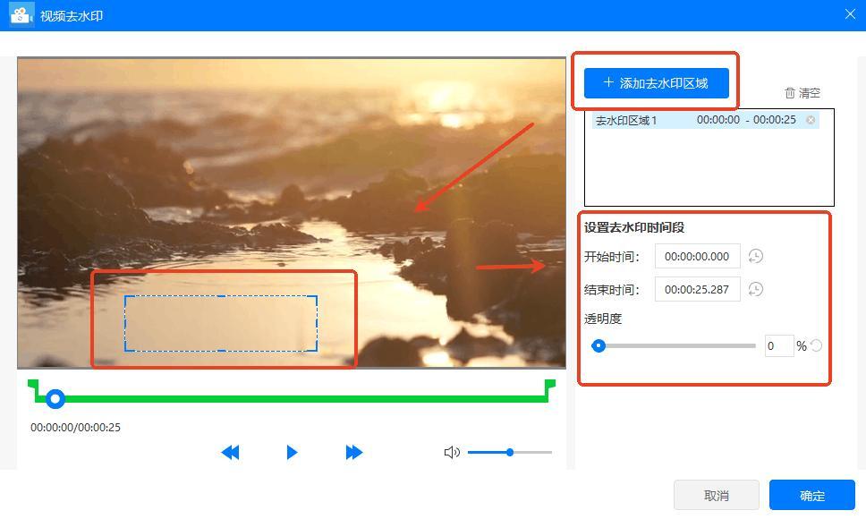 根據視頻畫面中的水印個數和難易程度,可以【添加去水印區域】,再設置去水印的時間段、透明度等,完成後點擊【確定】。