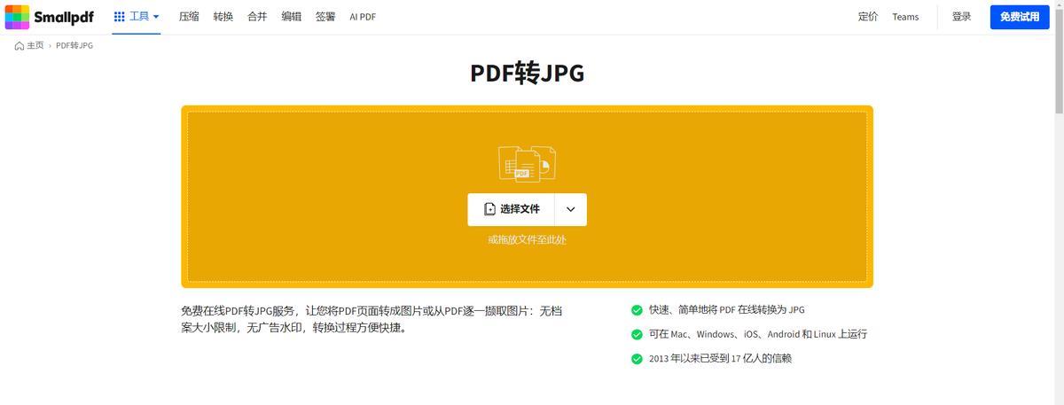 一個瑞士團隊做的在線PDF工具站,界面設計很清爽,功能入口一目瞭然。它的PDF轉圖片功能叫“PDF轉JPG”,打開網頁上傳文件就能用,不需要下載安裝任何東西,轉換完成後將圖片下載下來即可。