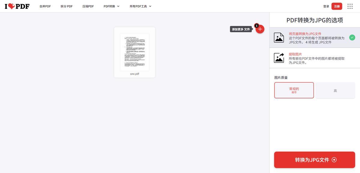 一個在線的PDF工具站,功能有很多,支持將PDF轉換成圖片格式,還能自定義設置圖片的質量,只需要在首頁選擇對應的功能,添加PDF,設置輸出的圖片質量等功能,最後點擊【轉換爲JPG文件】即可。