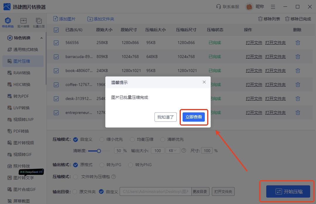 最後點擊右下角的【開始壓縮】,稍等一會即可得到壓縮成功的證件照圖片,點擊【立即查看】就能看到壓縮後的圖片了。