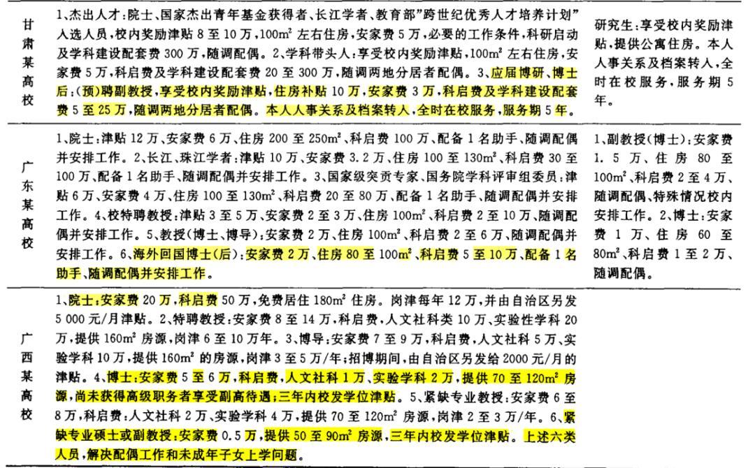 這一切不禁讓人想起20年前,與今天鋪天蓋地的“博士安家費”取消消息一樣,媒體上鋪天蓋地的是博士生“鉅額”安家費的報道——“廣州:博士後發十萬安家費”(2000年)、“蘭州師範引進教授博士提供十萬安家費”(2003年)。除了獨立於科研啓動經費的安家費外,學校們也紛紛向博士們提供80-100平不等的住房,以及“解決配偶工作和未成年子女的上學問題”……