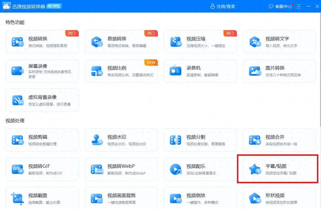 打開軟件,選擇首頁的【字幕/貼圖】,導入多個需要加字幕的視頻。