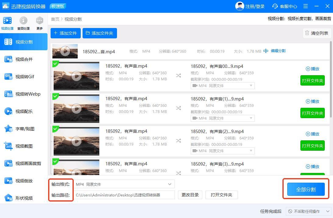 對其他需要分割的視頻繼續以上操作,然後點擊左下角的【輸出格式】和【輸出路徑】,最後點擊右下角的【全部分割】,就能得到分割後的視頻片段了。