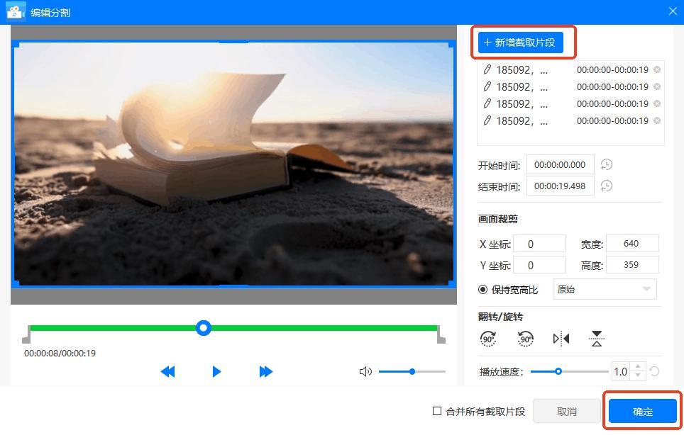 點擊【新增截取片段】,在左側的時間線上確定開始時間和結束時間,還能自定義旋轉或翻轉視頻、播放速度、合併所有截取片段等等。