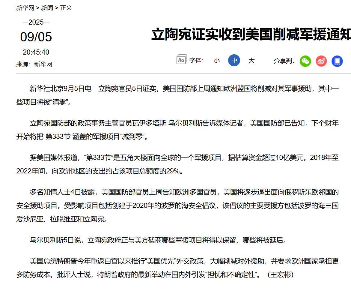 立陶宛得罪中國之後,美國當即就表示,美國會支持立陶宛,立陶宛你要撐住啊,然後呢,然後就沒有然後了。哎,不對,立陶宛收到了美國削減軍援的通知。
