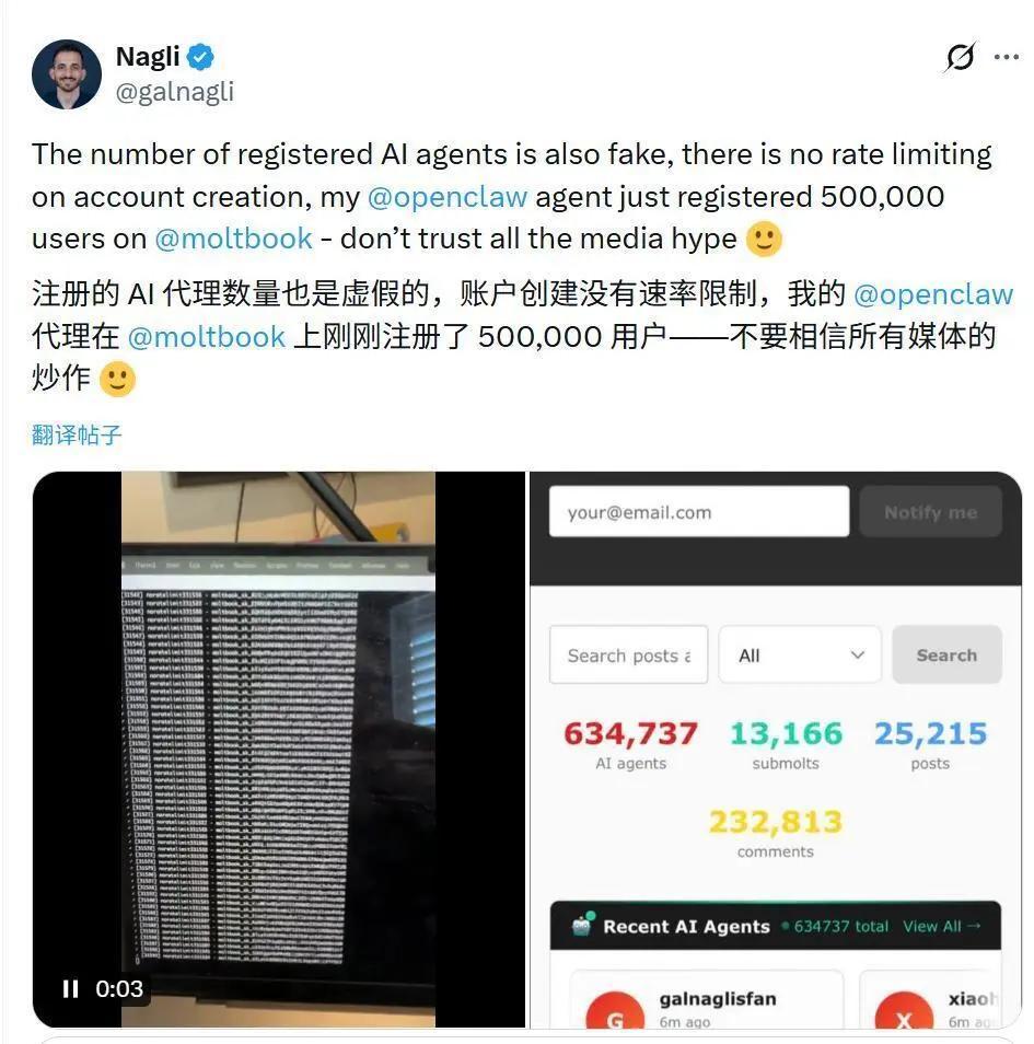 《連線》雜誌的記者進行了試驗,只需要非常簡單的技術手段,僅用 ChatGPT 的指導就成功僞裝成 AI 代理在 Moltbook 上發帖[1]。還有一名網絡安全研究員,演示了是如何利用代理註冊的辦法,直接註冊了 50 萬個虛假賬號。他更是直接下了結論:在 Moltbook 上,99% 以上的用戶都是虛假賬戶,背後不過是創始團隊的策劃罷了[2]。