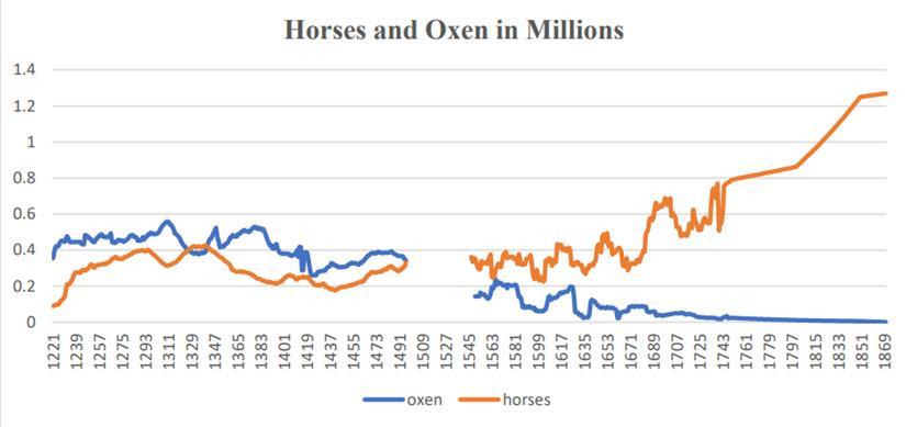 根據經濟史學家 Stephen Broadberry 等人的估算,英格蘭的馬匹最終在總量上反超了牛。早期牛是絕對的田間主力,14 世紀雙方開始縮小差距,隨着領主自營地制度的瓦解,牛的地位搖搖欲墜。到了 17 世紀,馬的數量迅速超車,並在 18 世紀將牛遠遠甩在了身後。也正是在這個卷王全面接管戰場的階段,英格蘭的農業產出迎來了爆發式增長[11]。