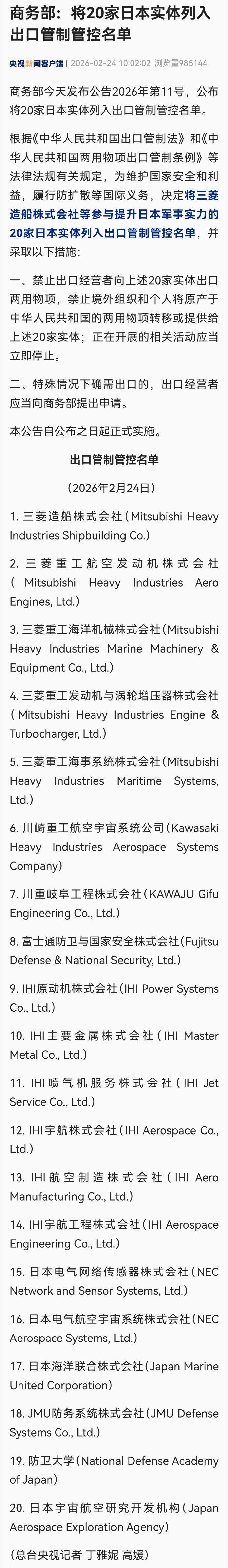 中國出手就見效,馬年工作日第一天,咱家就發佈公告,包括三菱重工、川崎重工在內的20家日本實體,被列入管制管控名單,禁止向其出口軍民兩用物項; 將斯巴魯株式會社等20家實體列入關注名單,也就是需要配合檢查,所生產的產品以及半成品,不涉及日本軍事用戶和軍事用途。