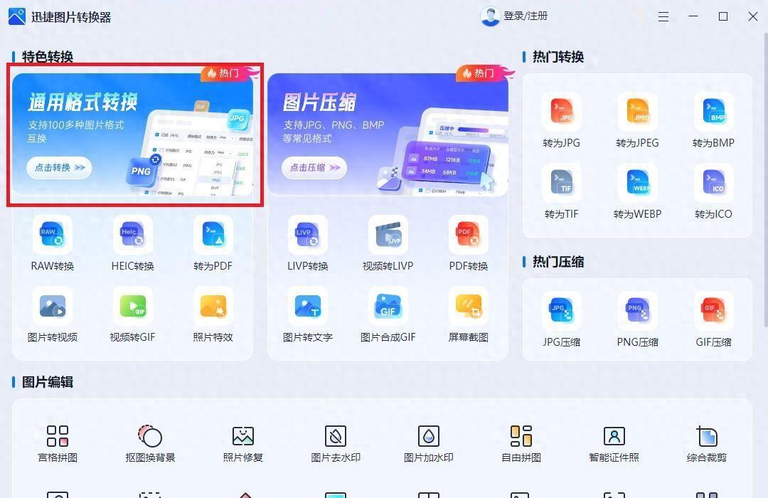 打開軟件,在首頁選擇【通用格式轉換】,點擊按鈕導入多張jpg圖片。