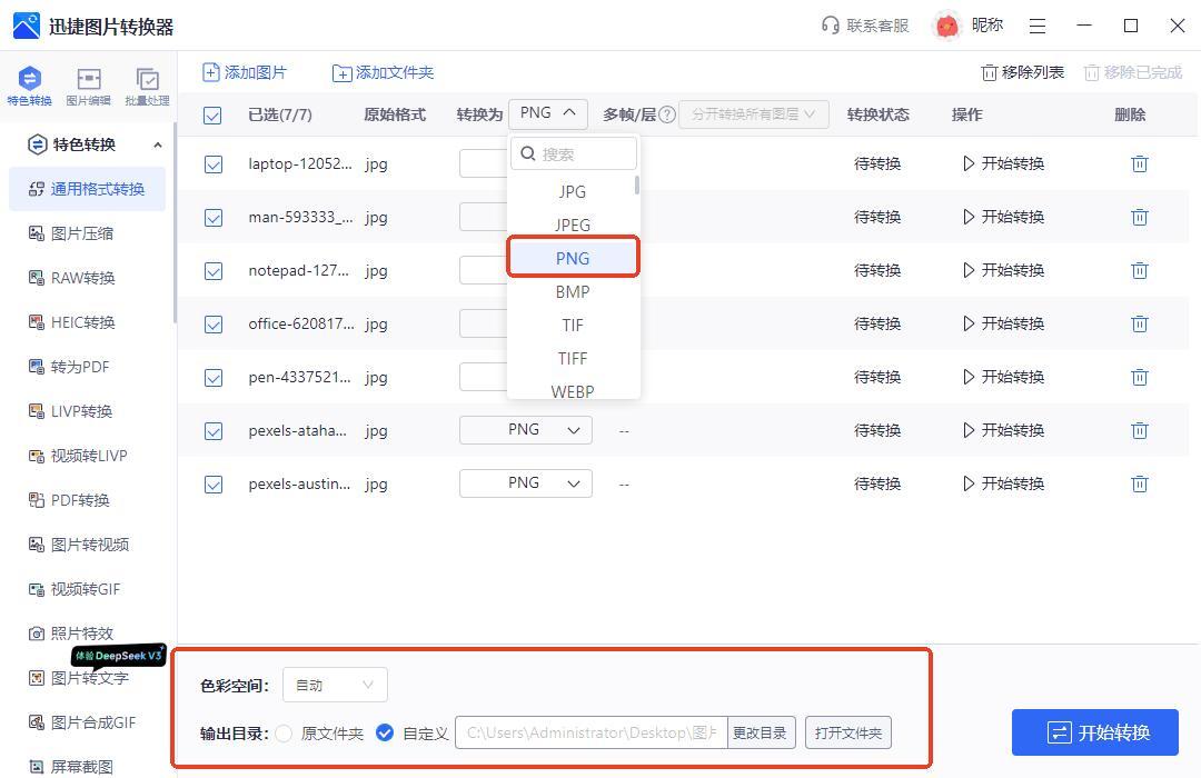 接着點擊【轉換爲】的下拉菜單,找到“png”作爲輸出格式,就能爲導入的jpg圖片一鍵設置爲同樣的輸出格式了。軟件還能對圖片進行色彩空間以及輸出目錄進行自定義調整。
