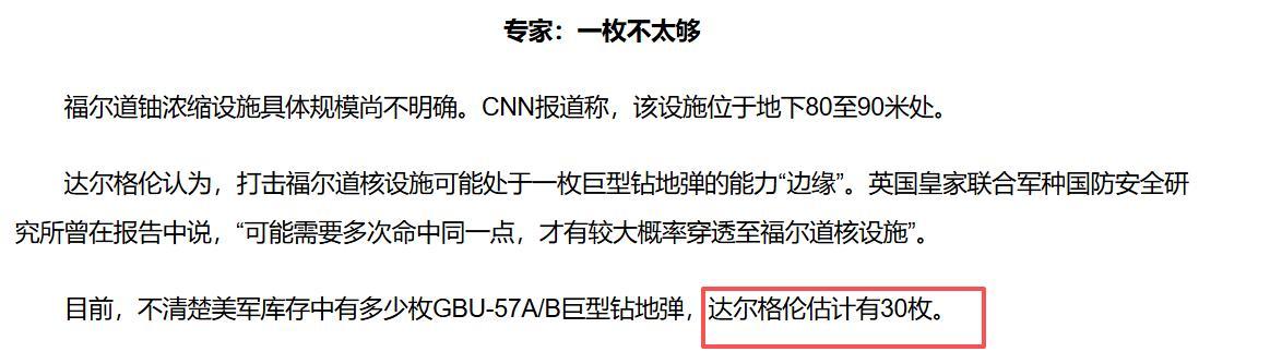 用於打擊伊朗核設施以及地下指揮所的GBU-57 鑽地彈,庫存預計只有30枚,而且上次用了6枚。