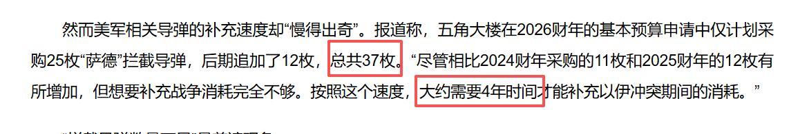 薩德的庫存不到350枚,去年美伊衝突,美國用了150枚薩德,是薩德庫存的1/4。 而且,五角大樓下的薩德訂單又非常少,2026財年才下單了37枚,也就是說,去年美伊衝突12天的消耗量,要花4年時間才能補充回來。