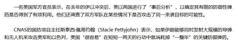 美國專家更是表示:如果伊朗能同時發射大規模導彈和無人機攻擊美軍和以色列,美國很容易在1-2天內,消耗掉“一整年”的關鍵防禦彈藥。