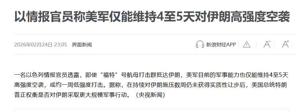 央視新聞報道,美軍目前的軍事能力,也僅能維持4至5天高強度空襲,或一週左右的低強度打擊。所以美軍打擊伊朗的戰術就是,短期內斬首,然後快速停火,避免陷入消耗戰。