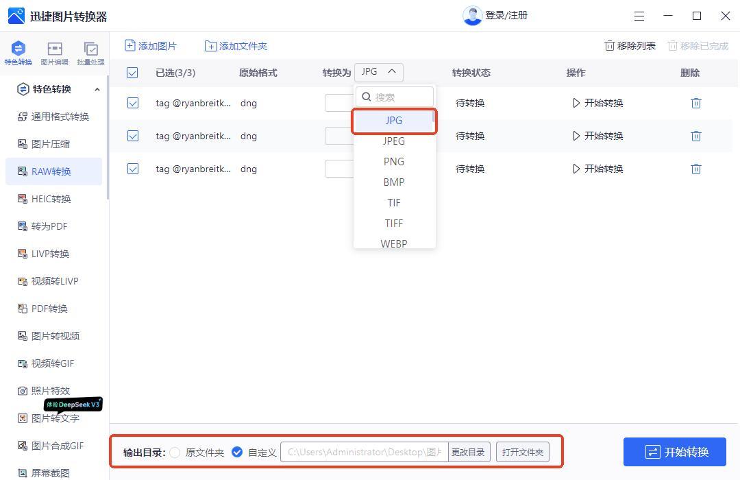 在軟件首頁找到【raw轉換】,導入多張raw文件後,在【轉換爲】中找到“JPG”,就能爲導入的raw統一設置“JPG”爲輸出格式。