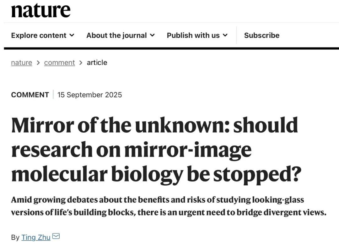 2025年9月,英國《自然》雜誌邀請鏡像分子生物學領域開創者之一、西湖大學朱聽教授,發表評述《未知之鏡:鏡像分子生物學研究是否應被叫停?》(Mirror of the unknown: should research on mirror-image molecular biology be stopped? Nature 645, 588–591, 2025)。該評述提出,與其因擔憂遙遠的潛在風險而叫停當前研究,不如在前沿創新與倫理安全之間尋找有機平衡,發掘技術突破的巨大潛力,擁抱鏡像生物學世界的無限可能。本文爲該評述的中譯文。