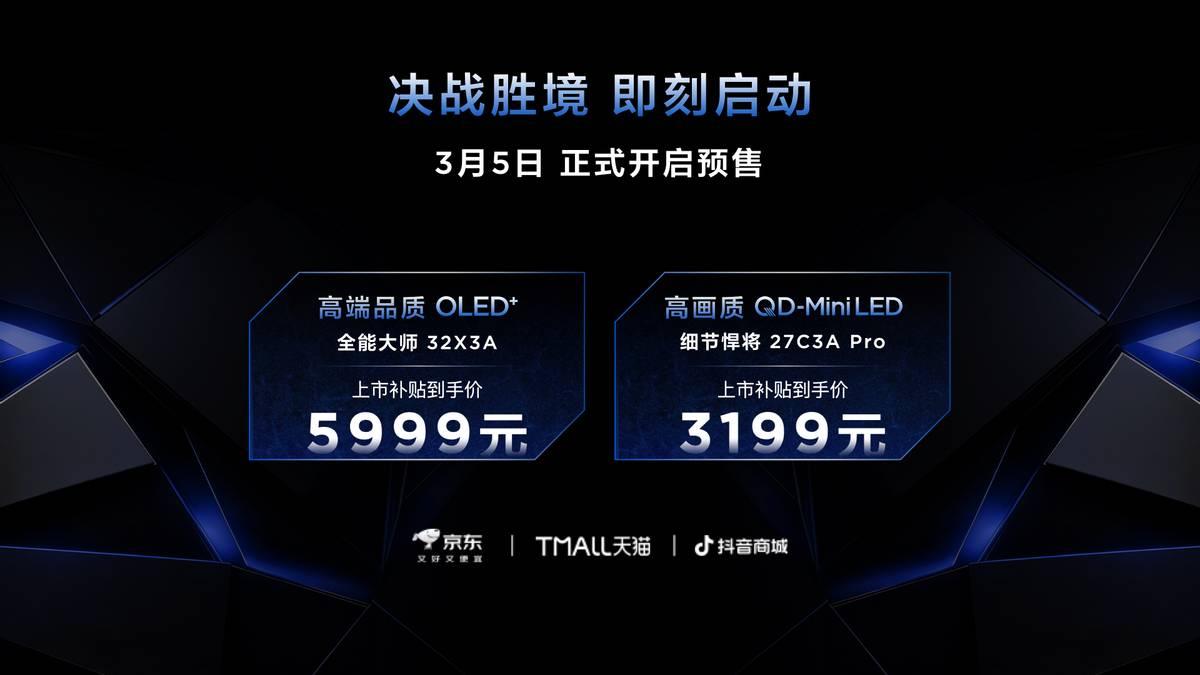 通往“勝境”的大門已經開啓。“全能至臻”32X3A上市首發價5999元,“細節悍將”27C3A Pro上市首發價3199元,即日起在TCL官方商城及各大合作平臺開啓預售。本次發佈不止於三款旗艦產品,而是一個完整的系列產品。除了作爲標杆的X3A、C3A Pro和P2A Ultra,每個系列旗下都提供不同尺寸、不同規格配置的版本,無論需求選擇如何、桌面空間多大、功能側重有何不同,都能在TCL顯示器中找到最適合的那一款。