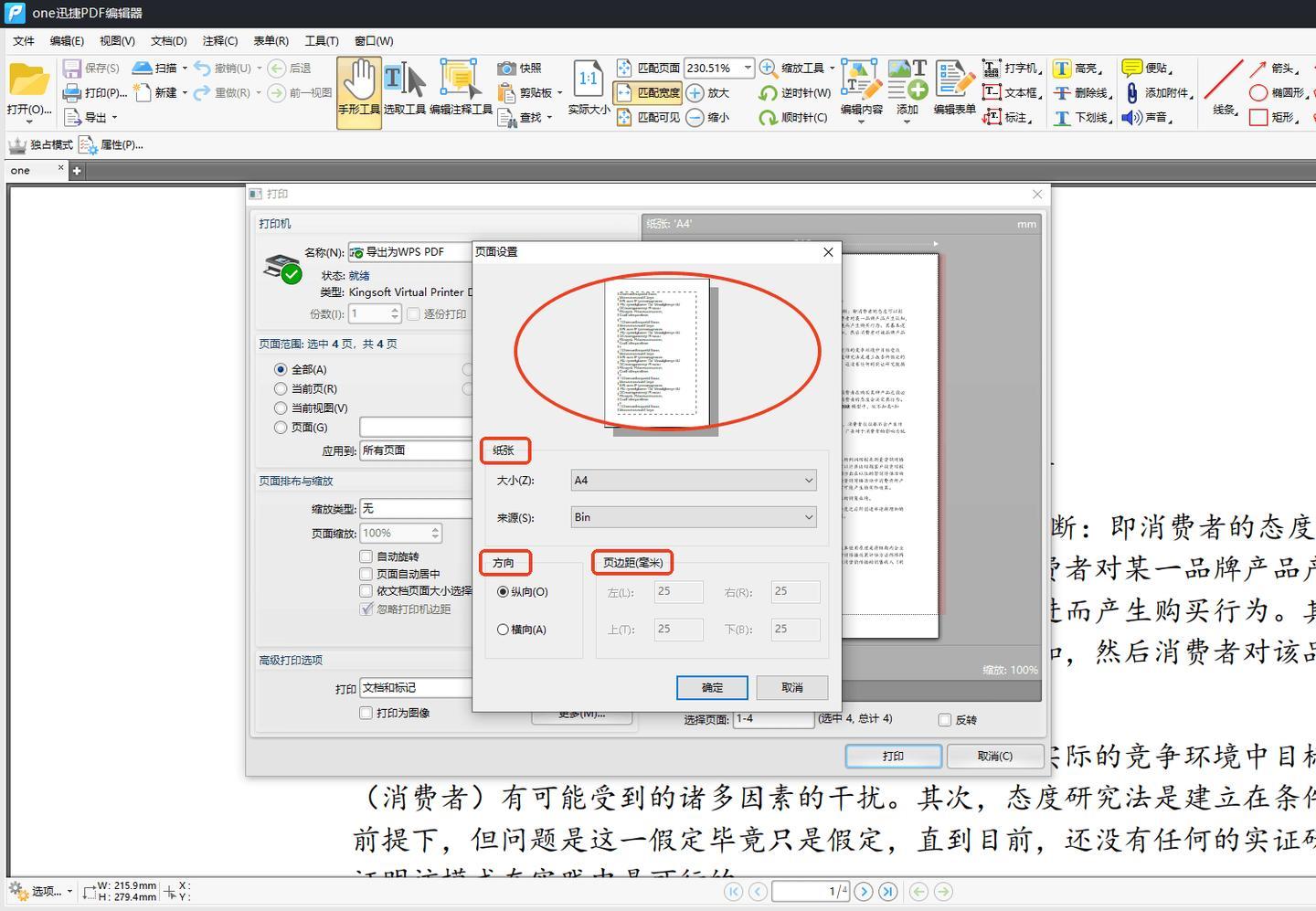 進入頁面設置以後,將紙張大小改爲A4,方向設爲縱向,然後再調整一下其他參數,在調整的同時可以可以在上面預覽效果,滿意了點擊【確定】進入下一步。