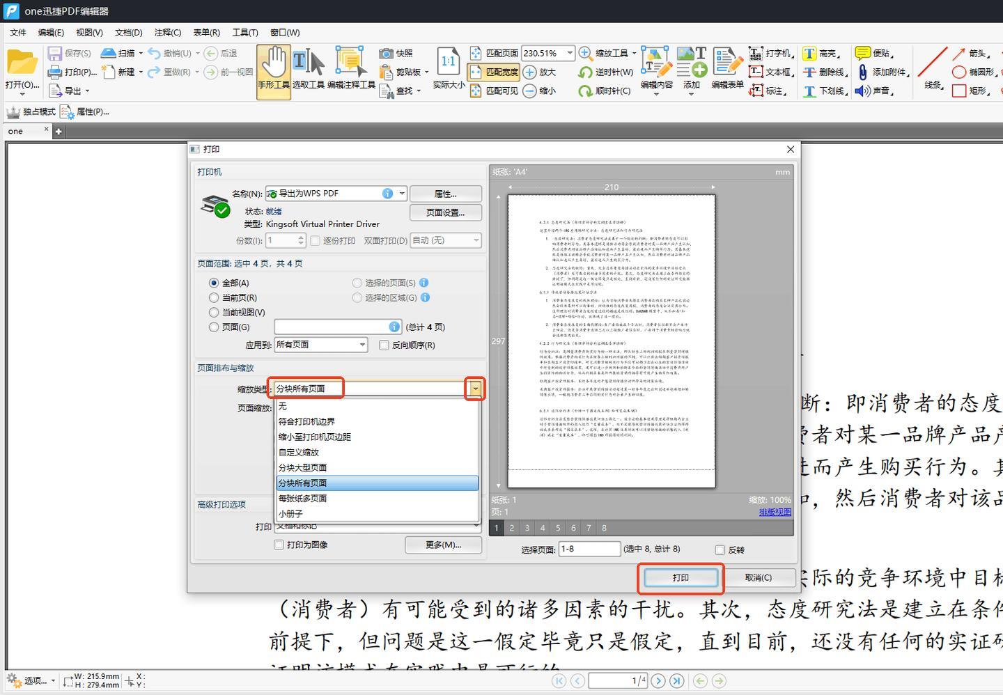 點擊【縮放類型】右側的下拉按鈕,選擇【分塊所有頁面】,最後點擊【打印】即可得到A4紙了。