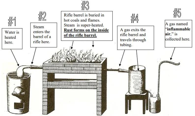 首先,他把一個裝有水的球形玻璃皿放在一個爐子上加熱,這樣就可以生成純淨的水蒸氣。水蒸氣被引入一根鐵管中,這根長長的鐵管橫穿過一張爐臺,在爐臺上又鋪滿了燒紅的碳。鐵管被這些碳燒成了紅色,水蒸氣通過這根處於紅熱狀態的鐵管後,被引入到一根彎曲成彈簧狀的鐵管中,而這根彈簧狀的鐵管則浸泡在冰冷的水中。這樣一來,鐵管中的水蒸氣會被再次冷卻。鐵管的末端被接到一個用來收集冷凝水的瓶子中,瓶子的上方再通過一根管子連接到一個用來收集剩餘氣體的瓶子。整個系統是一個密封得很好的封閉系統。