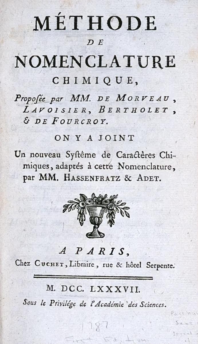 在這個過程中,拉瓦錫鬱悶地發現,儘管自己擁有全世界最豪華的實驗室,居然沒有一種基本物質是自己首先發現的,自己所知道的所有的基本物質都被別人提前發現過。1787 年,化學史上第一本專門給物質命名的書,《化學命名法》出版,包括拉瓦錫在內,一共有四個作者。