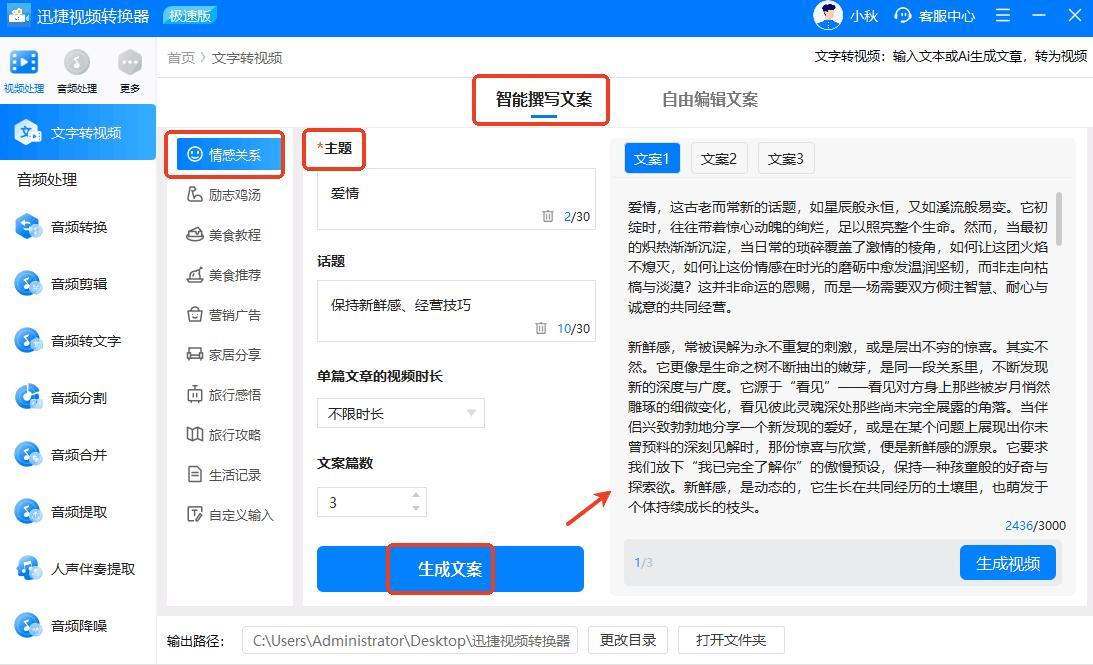 接着設置主題、話題、單篇文章的視頻時長、文案篇數然後點擊【生成文案】,就能在右側看到生成的3篇文案了。