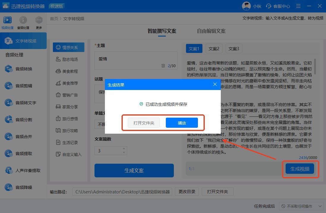 選擇一篇需要合適的文案,可以對其進行編輯,然後點擊右下角的【生成視頻】,等待一會即可順利生成並直接保存在文件夾中,這時可以點擊【播放】。
