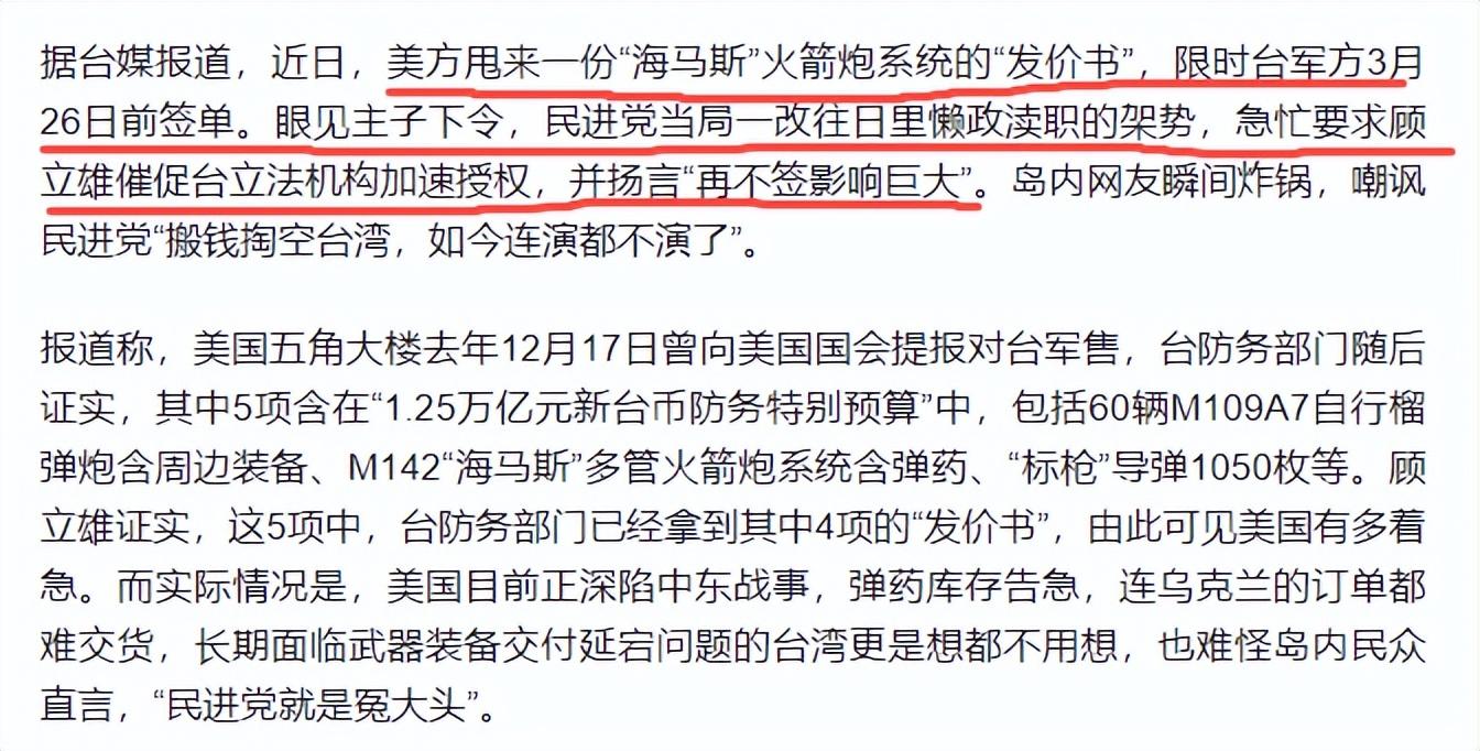 而壓垮藍白的最後一根稻草是美方的限期通牒,3月10日臺“國防部長”顧立雄證實,3月6日已收到美方“海馬斯”系統發價書,有效期至3月26日,逾期不籤就作廢,臺灣將徹底失去採購資格。
