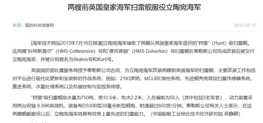 2013年,立陶宛海軍又接收了2艘英國退役軍艦 “狩獵”級掃雷艦,排水量約750噸。