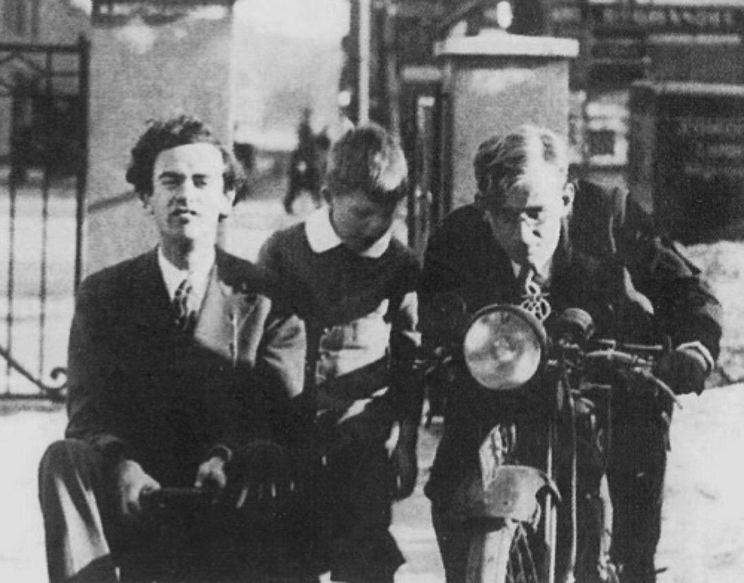 1929年,列夫·朗道(左)與喬治·伽莫夫(右)騎着摩托車,中間載着的尼爾斯·玻爾的兒子(中)