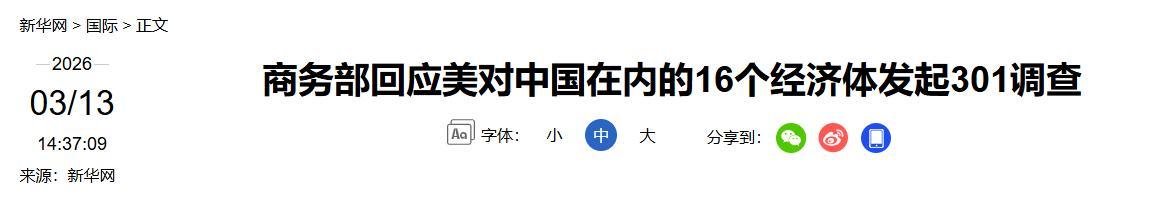 新華網202603/13——商務部回應美對中國在內的16個經濟體發起301調查