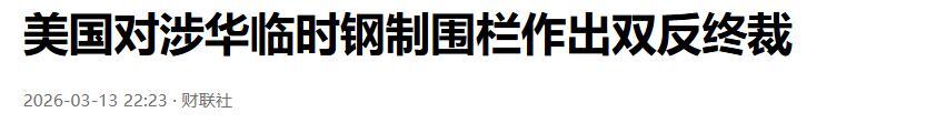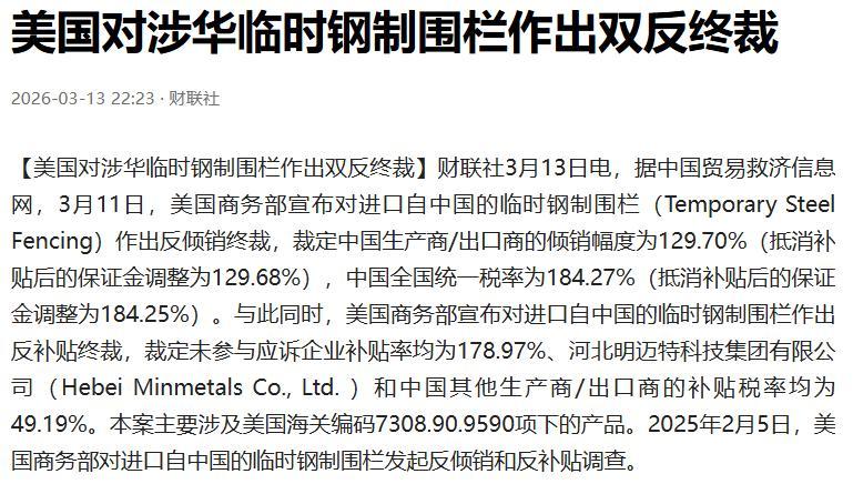 財聯社2026-03-13——美國對涉華臨時鋼製圍欄作出雙反終裁