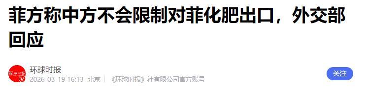 環球時報2026-03-19——菲方稱中方不會限制對菲化肥出口,外交部回應