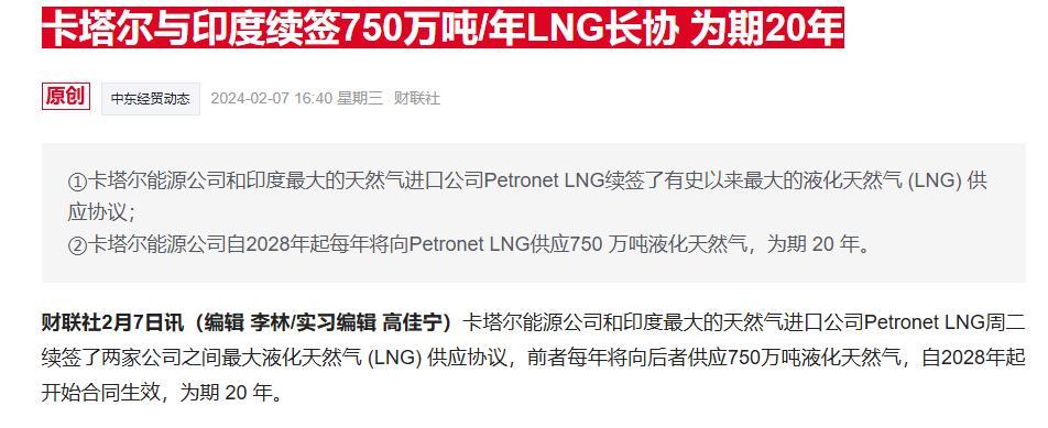 印度雖然能生產尿素,可尿素是由氨製成,而氨則由天然氣製造。可以說,尿素生產成本70%是天然氣,印度進口天然氣,主要來自卡塔爾,每年要從卡塔爾進口約1000萬噸LNG,2024年還和卡塔爾續簽了每年750萬噸的LNG協議,爲期20年。