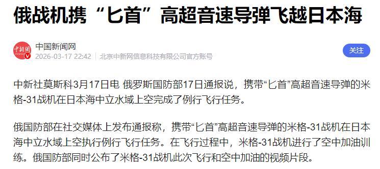 3月17日,俄羅斯國防部官宣,俄軍米格-31戰機掛載着“匕首”高超音速導彈,在日本海中立水域完成了一次計劃內飛行。
