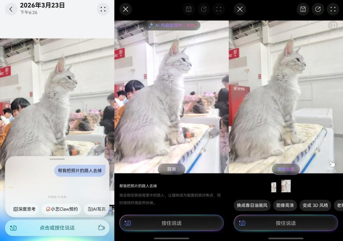 有了小藝修圖智能體,我直接語音讓TA幫我修圖。在圖庫長按導航條喚醒小藝修圖智能體,說一句“幫我把照片裏後面那幾個人去掉。”小藝便會自動消除路人,效果像原片一樣,完全沒有塗抹痕跡。然後,我們還可以給圖片調色,“把天空換成藍天白雲”,或“生成春日油畫風格”,小藝瞬間就能爲你換上明媚天氣或藝術濾鏡。無需懂複雜的修圖參數,一句話就能修出春日大片。