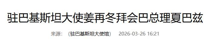 信息來源:外交部--駐巴基斯坦大使姜再冬拜會巴總理夏巴茲--2026年3月26日