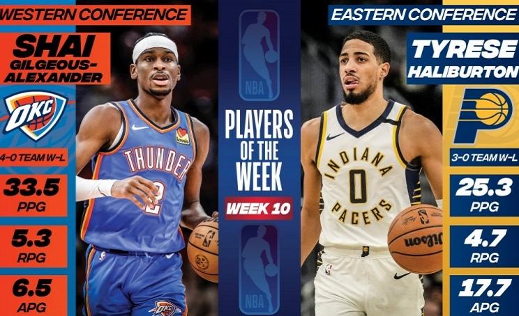 NBA官方公佈了上週東西部周最佳球員,東部由步行者後衛哈利伯頓當選,西部由雷霆後衛亞歷山大當選。哈利伯頓上週場均貢獻25.3分+4.7籃板+17.7助攻+1.7搶斷的恐怖數據,命中率位50.9%,三分球命中率爲41.7%,帶領步行者取得3勝0負的戰績。據統計,這是哈利伯頓生涯第2次當選周最佳球員。亞歷山大上週場均爆砍33.5分+5.3籃板+6.5助攻,三項命中率爲50.1%,40.6%和85.6%,帶領雷霆取得4勝0負的戰績。據統計,這是亞歷山大生涯第4次獲此殊榮。值得一提的是,濃眉、東契奇、福克斯、小薩、亨德森、塔圖姆、蘭德爾、莊神等球星獲得了周最佳提名。