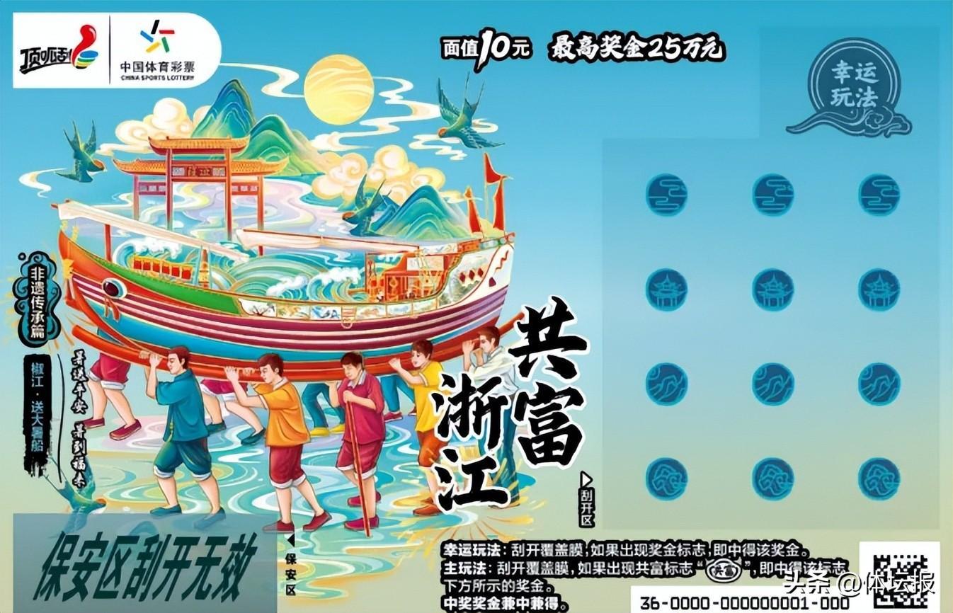 2023年,浙江體彩推出“共富浙江”主題即開型體育彩票“綠水青山篇”“非遺傳承篇”“賽事助力篇”,以浙江省山區26縣知名山水風景、非物質文化遺產、省內九大優質體育品牌賽事爲背景,詮釋綠色發展理念,激發非遺經濟活力,展現體育建設成果。