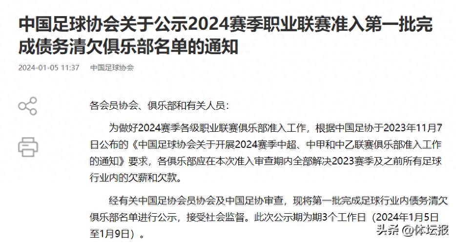 1月5日,中國足協在其官方網站公佈2024賽季職業聯賽准入第一批完成債務清欠俱樂部公示名單。