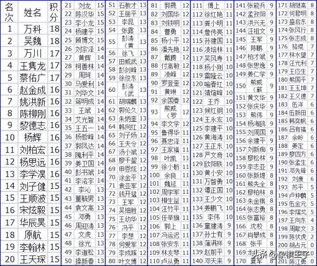 同場另一盤,吳魏贏下陝西省冠李小龍,這樣,萬科與吳魏同爲七勝四平18分,比較對手分,萬科116較高,驚險封冠,攬下三萬頭獎,吳魏小分112略低,屈居亞軍,一萬。