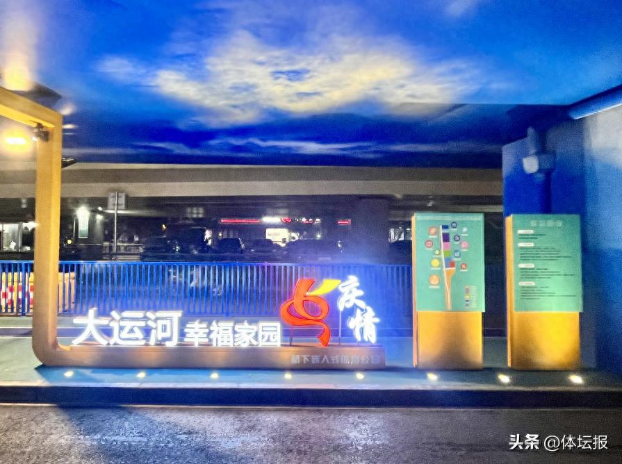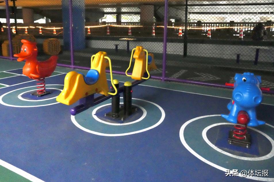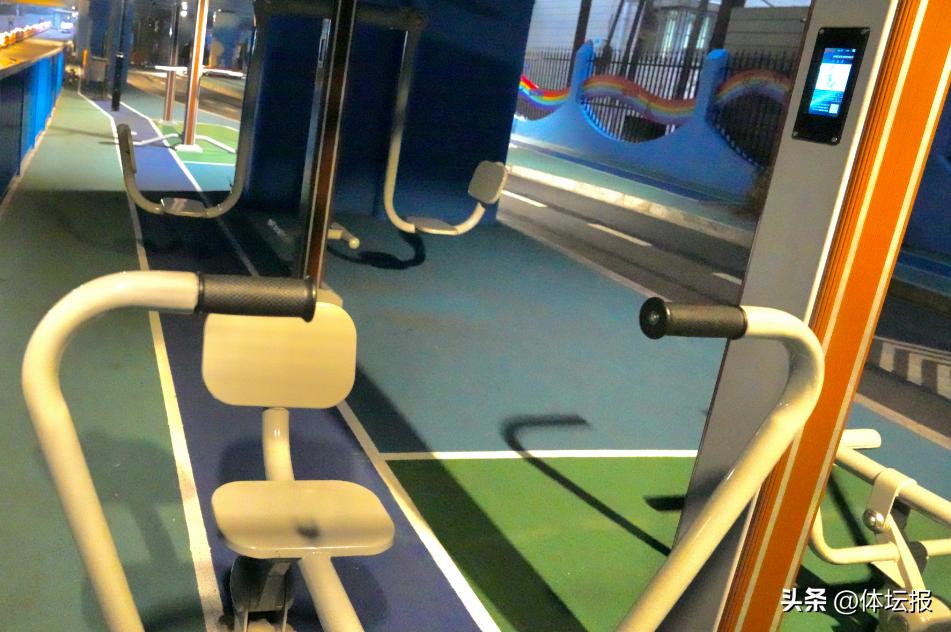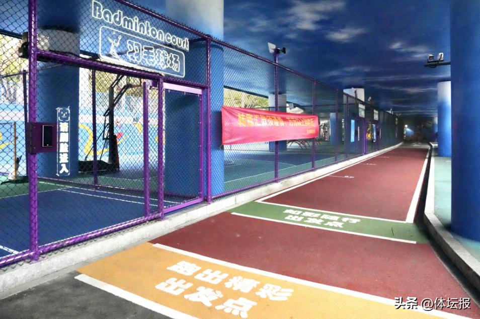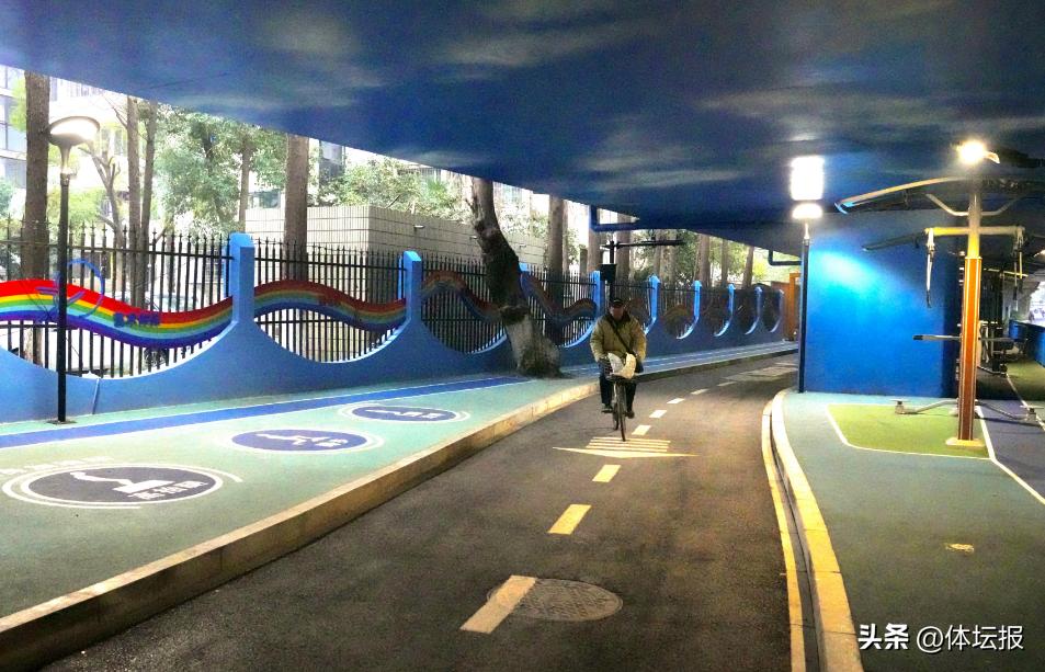 頭頂是“藍天白雲”,兩旁湛藍跑道上陳列着各式運動器材,橋下一側的寬敞處,還多了一片設有各類體育場地的公園。