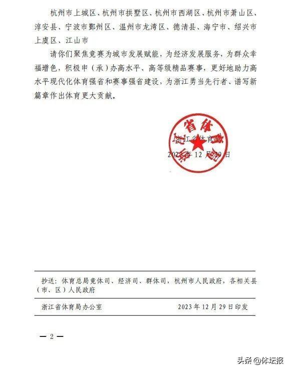 杭州市上城區、拱墅區、西湖區、蕭山區、淳安縣,寧波市鄞州區,溫州市龍灣區,德清縣,海寧市,紹興市上虞區,江山市等11個縣(市、區)則榮膺省級“賽事集聚縣”。