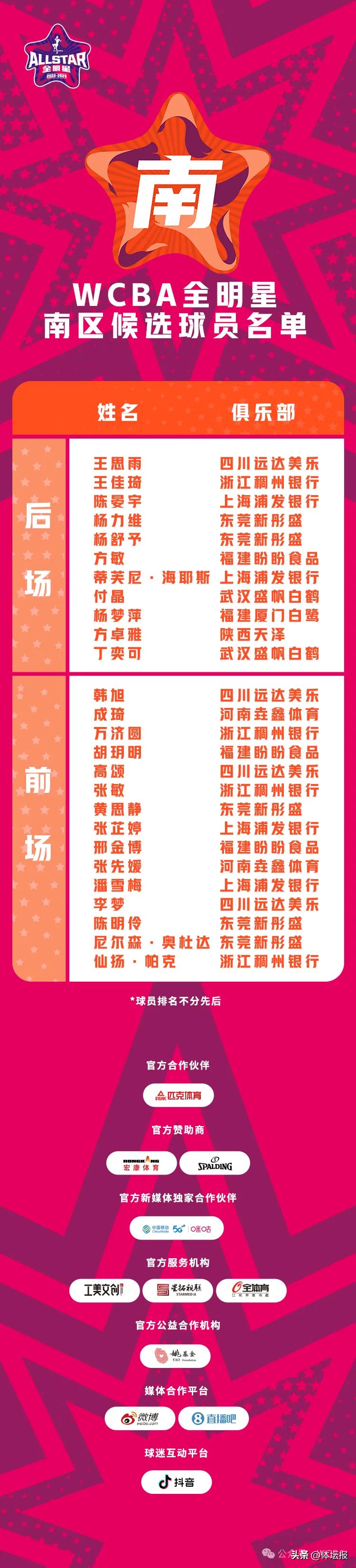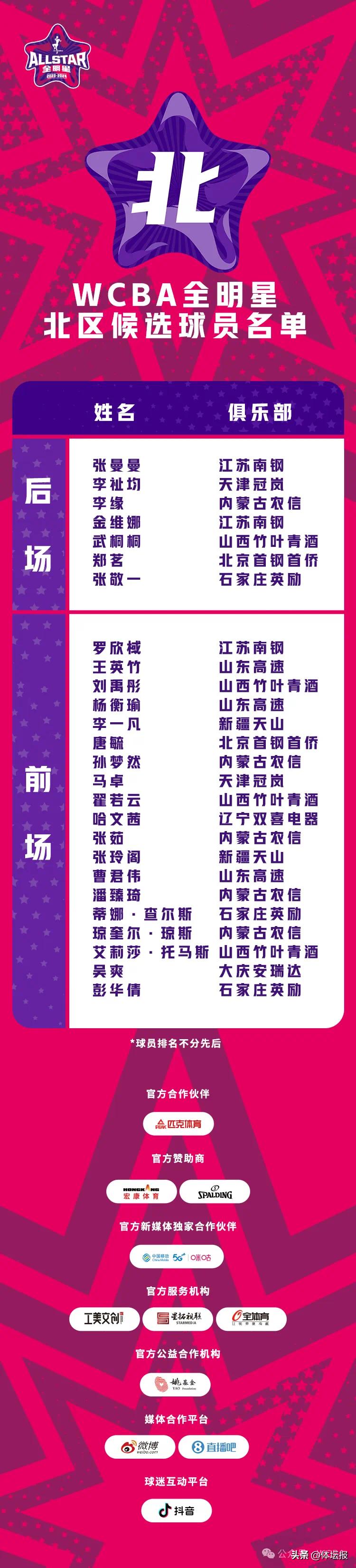 1月17日,2023-2024賽季WCBA全明星候選人名單出爐,南北區候選名單各26人,由各項數據榜單排名靠前球員、俱樂部推薦球員、組委會推薦球員組成。