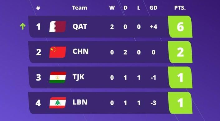 反觀同組的黎巴嫩和塔吉克斯坦,兩支球隊都只有1分入賬,末輪正面對抗,勝負關係直接影響出線形勢,甚至會左右中國隊的命運,因爲一旦國足輸給了卡塔爾,那麼只要黎巴嫩和塔吉克斯坦分出勝負,中國男足鐵定出局了。